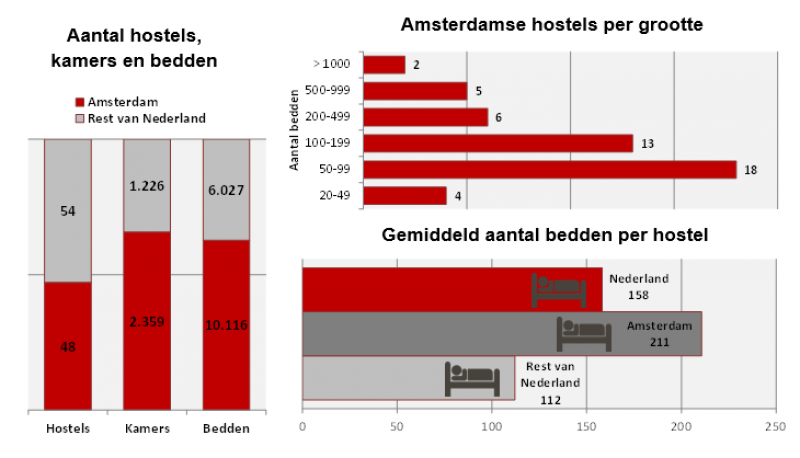 In Nederland is de gemiddelde grootte van een hostel 158 bedden. Voor de hostels in Amsterdam geldt dat het gemiddelde aantal bedden per hostel aanzienlijk hoger is dan het landelijk gemiddelde, namelijk 211 bedden. Dit komt voornamelijk door een aantal grote hostels van internationale ketens zoals Meininger en A&O, welke zich in Amsterdam hebben gevestigd de afgelopen jaren, en meer dan 1.000 bedden aanbieden. De gemiddelde grootte van de hostels in de overige delen van Nederland is 112 bedden en 23 kamers.