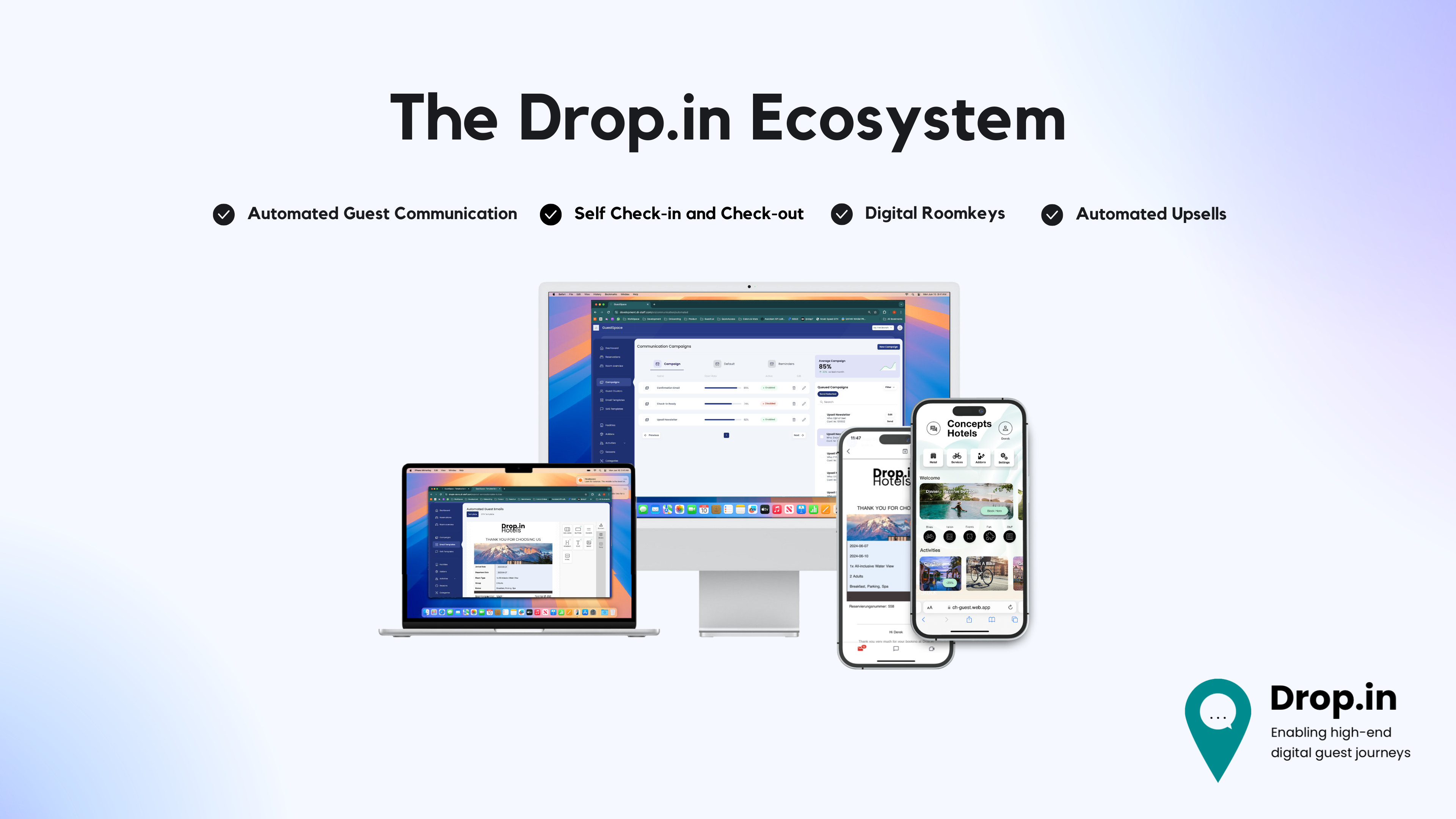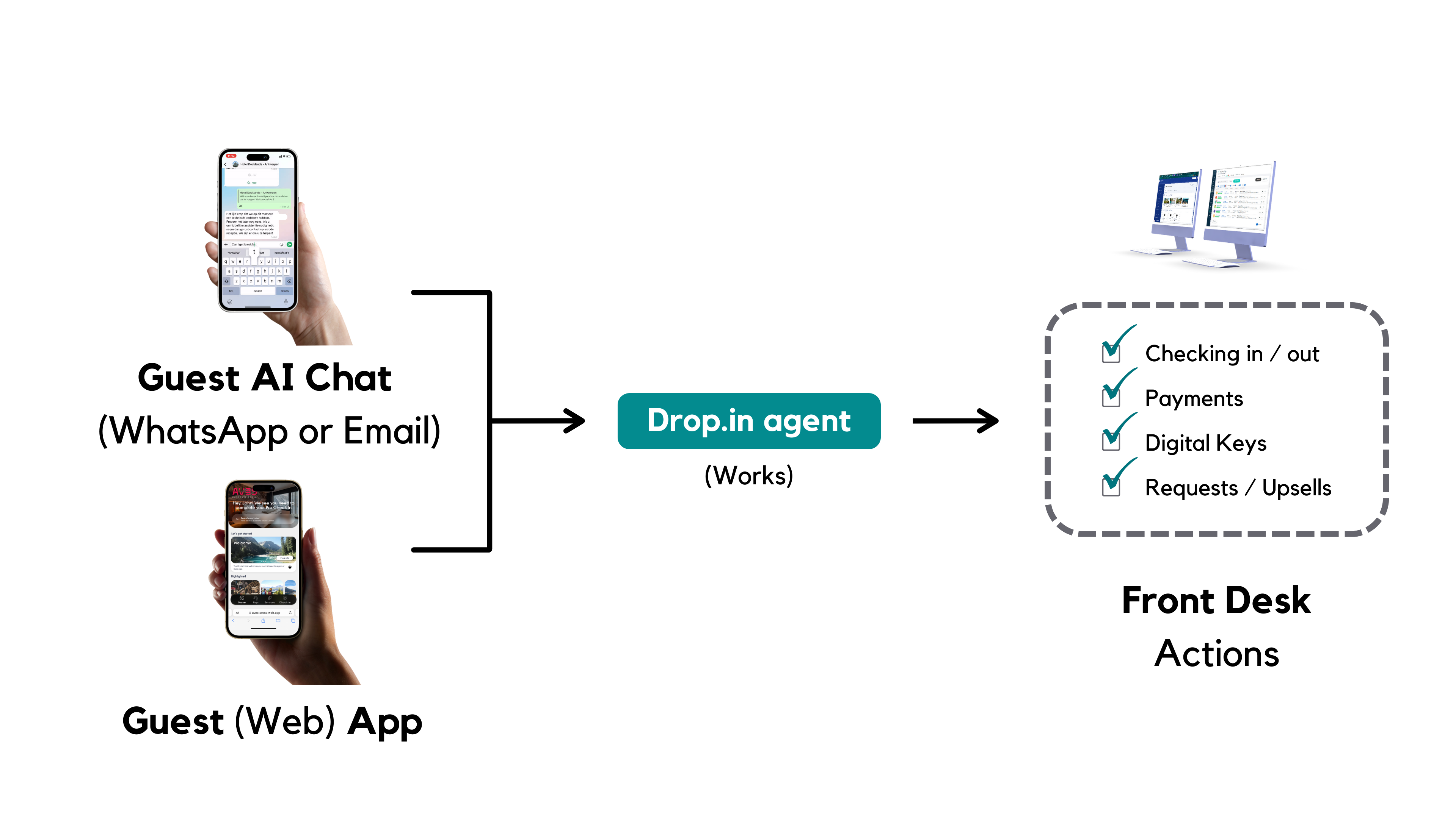 Drop.in is een full-stack frontdesk-agent die de volledige guest journey zelfstandig laat verlopen. De agent automatiseert niet alleen communicatie, maar vooral de 'core tasks' van een front desk: check-in, betalingen, sleuteluitgifte, upsells en gastverzoeken.
