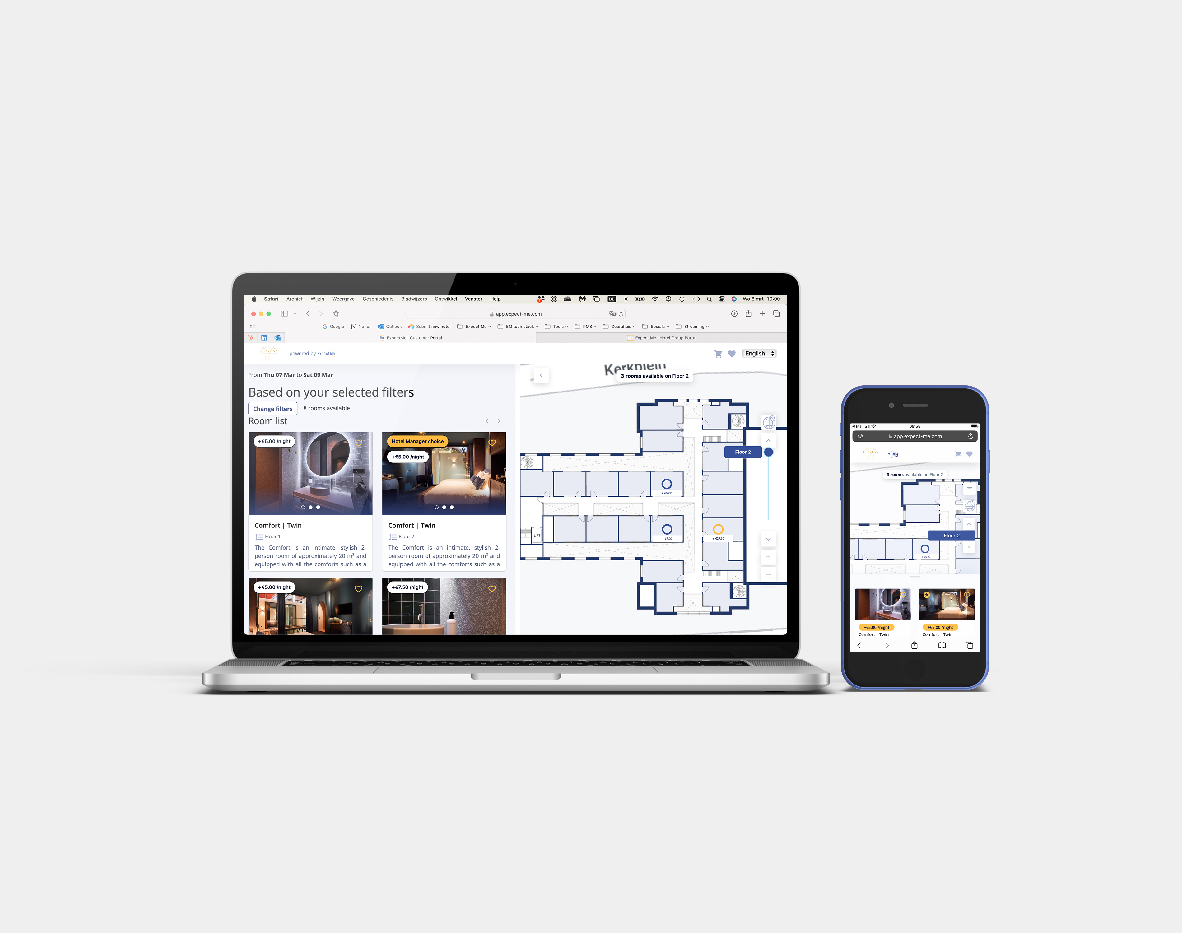ExpectMe ExpectMe is het platform voor kamerselectie waarmee gasten hun favoriete hotelkamer kunnen kiezen vóór aankomst — net zoals het selecteren van een stoel in het vliegtuig. Naadloos geïntegreerd in uw systemen voor een vloeiend proces voor zowel gast en team. Bedrijf: ExpectMe |