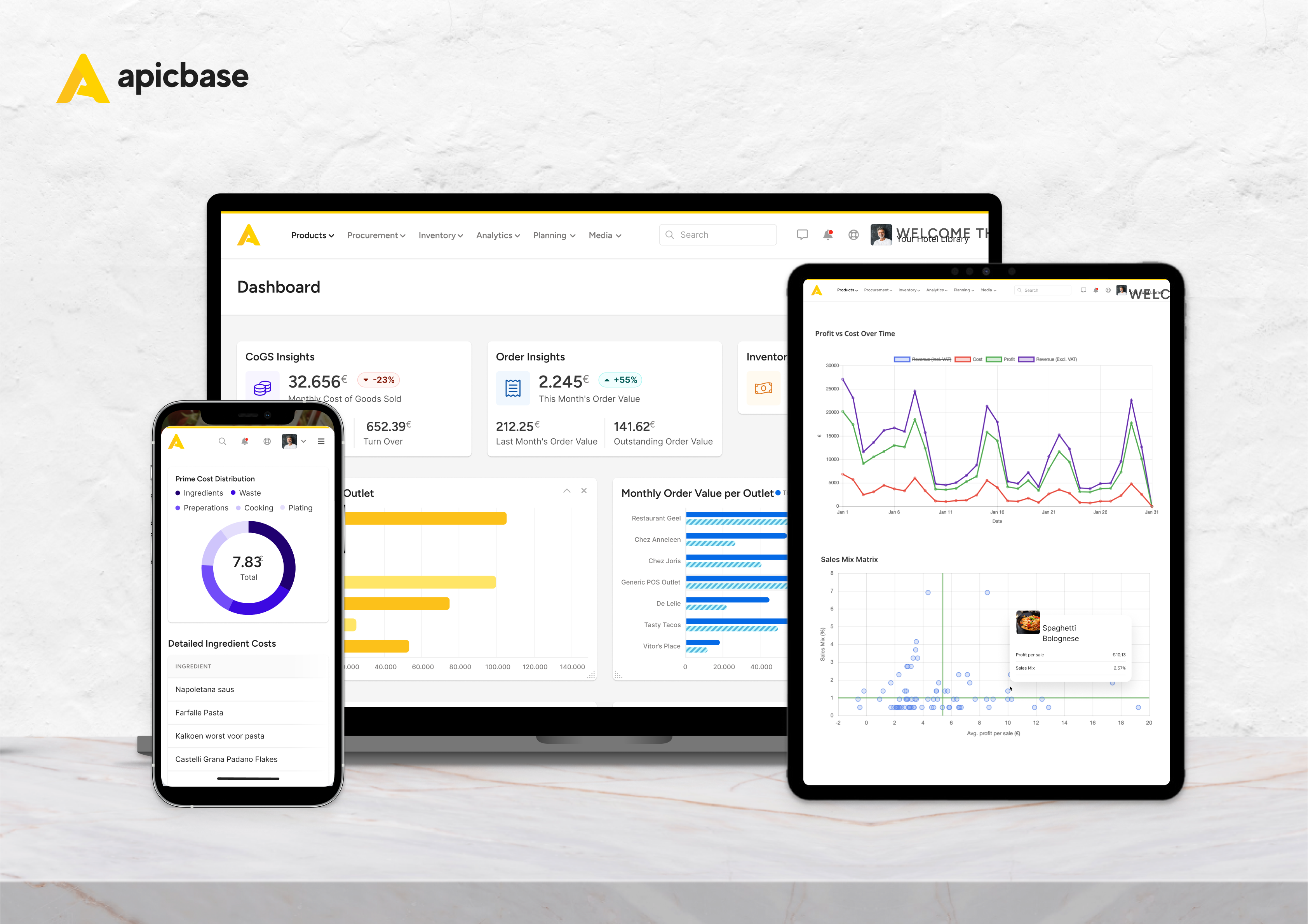 Apicbase Apicbase is een platform voor het beheer van food & beverage in hotels. Het centraliseert recepturen, voorraad, inkoop, rapportages en HACCP in één systeem. Het ondersteunt u bij datagedreven keuzes, verlaagt uw foodcosts en houdt grip op alle outlets, van ontbijt tot bar en restaurant. Bedrijf: Apicbase NV |