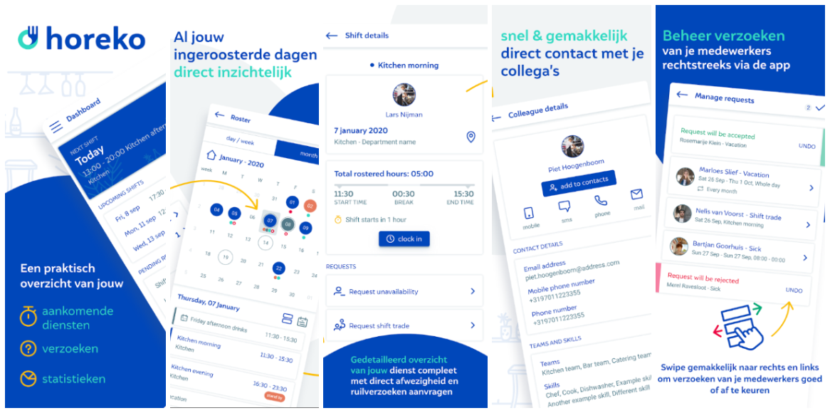 Horeko Horeko Employee Manager is een app voor het registreren van uren, bekijken van roosters en onderling ruilen van diensten. Alle functionaliteiten zijn gebundeld in één overzichtelijke app, waardoor losse berichtjes via WhatsApp overbodig worden. Bedrijf: Horeko |