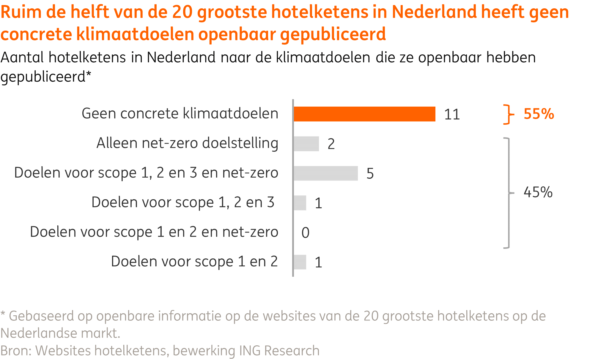 Uit een inventarisatie van ING Research onder de twintig grootste hotelketens die actief zijn op de Nederlandse markt blijkt dat meer dan de helft van de hotelketens geen concrete klimaatdoelen openbaar heeft gepubliceerd. Sommige hotelketens hebben niet meer dan een algemene MVO-verklaring op hun website staan. Bovendien zijn veel duurzaamheidsrapporten van hotelketens zeer summier, ook die van enkele grote internationale ketens.
